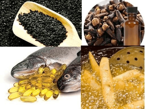 Pics Lf to rt 1. Black seeds, 2. clove oil. 3 fish oil, 4. French fries -commercial use of French fries fried in vegetable oil loaded with trans fat. Eucalyptus oil is commonly steam distilled from the leaves , highly flammable , natural disinfectant & pest detergents. It should be stored in a dark bottle, kept in a cool place out of sunlight. 2. Clove oils- an essential oil , natural analgesic / antiseptic used in dentistry- home remedy for dental pain & toothache, sore gum, removes bad breath. 3. Black seed oil - An amazing herb black seed oil has spicy pungent flavor is freshly cold pressed ( first pressing) using the highest quality of genuine organic Nigella Sativa seeds. It has anti bacterial & anti mitotic effect used for inflammation, fungi infection & anti histamine like effect.
